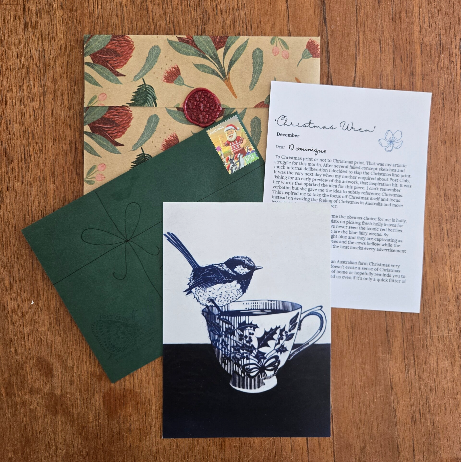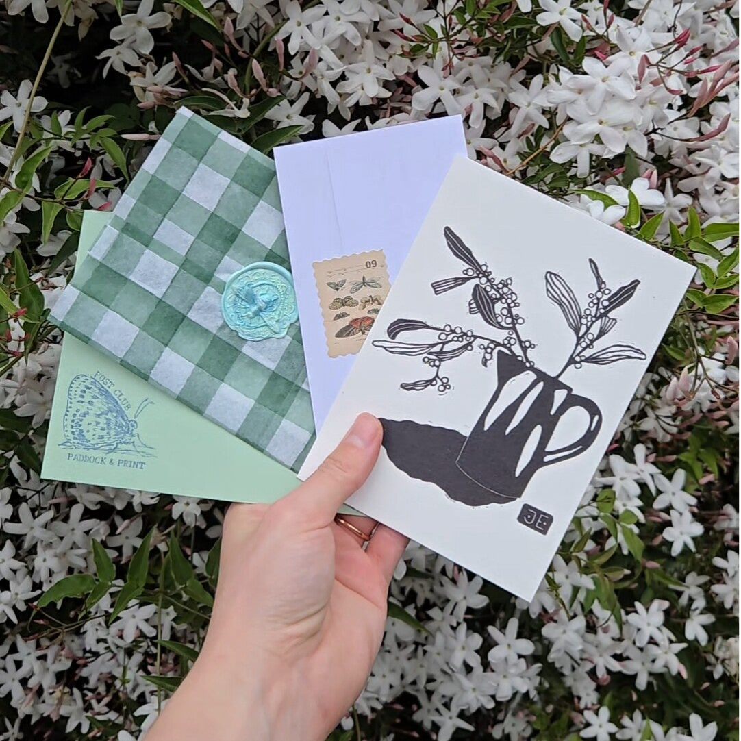 Recipients will recieve a 5x7" art print and artist's letter hand wrapped in beautiful paper and sealed with a wax stamp. They will also go into the draw every month to win an original linoprint from Post Club.